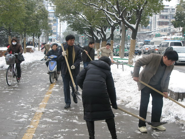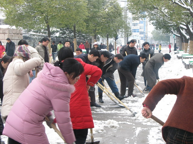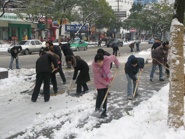 公司全體員工不顧天寒地凍,熱火朝天的在街頭揮鍬鏟雪,迅速清除了公司院內、門(mén)前及榮事達大道市府廣場(chǎng)至壽春路段交通主干道的路面積雪,保證了公司出入車(chē)輛及門(mén)前交通干道的行車(chē)安全,受到市民的贊許。