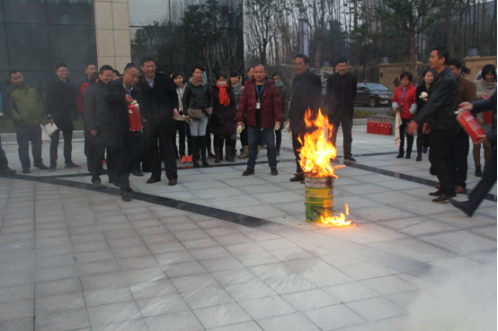 隨后集團公司組織員工在建投大廈內部開(kāi)展消防應急預案演練。隨著(zhù)急促緊促的警報聲響起,頓時(shí)消防通道內濃煙滾滾,大廈內員工迅速在疏散員引導下彎著(zhù)腰,用毛巾捂著(zhù)嘴、緊靠墻邊,從大廈南北二側安全通道快速有序的向安全地帶疏散。接著(zhù),全體員工在建投大廈南廣場(chǎng)開(kāi)展了滅火器撲救油盆火災的實(shí)地演練。