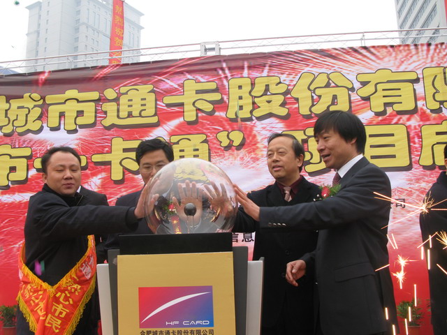 2007年12月18日上午,合肥城市通卡股份有限公司暨“城市一卡通”項目啟動(dòng)儀式在合肥市市政府廣場(chǎng)隆重舉行。合肥市委副書(shū)記、市長(cháng)吳存榮,安徽省信息產(chǎn)業(yè)廳廳長(cháng)賀凌、合肥市政協(xié)主席周富如、合肥市委副書(shū)記董昭禮、合肥市人大常委會(huì )常務(wù)副主任甄長(cháng)琢、合肥市副市長(cháng)江明、安徽省建設廳總工程師仲亞平及市直有關(guān)部門(mén)負責同志出席了啟動(dòng)儀式。